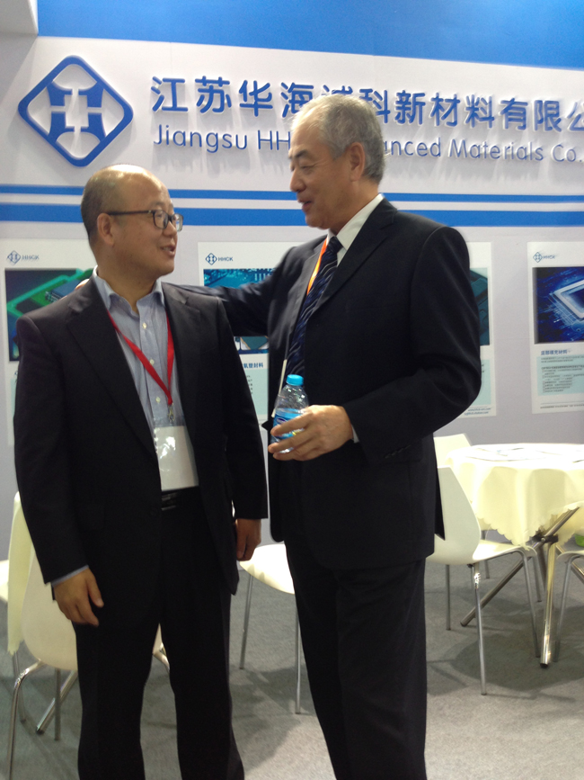 江蘇華海誠科在第十二屆IC CHINA 展會(huì)上的展區(qū)公司領(lǐng)導(dǎo)與客商熱情交談